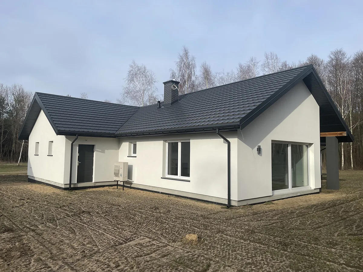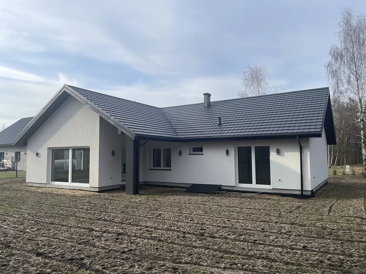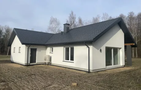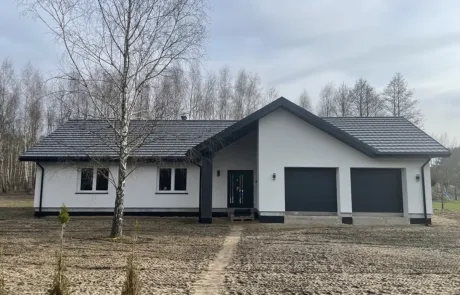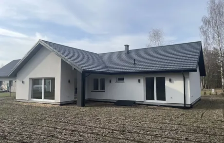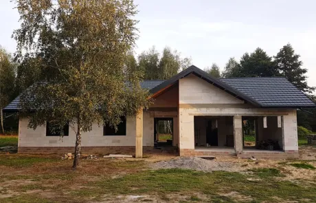 W przypadku tego projektu Inwestor doskonale wiedział, jak ma wyglądać jego dom. Był to parterowy budynek z salonem, trzema pokojami, kuchnią, dwiema łazienkami, kotłownią i spiżarnią. Charakterystyczną częścią budynku był garaż dwustanowiskowy z dwiema oddzielnymi bramami. Projekt został już wybrany na jednej z popularnych stron w Internecie. Ponieważ Klient chciał zwiększyć powierzchnię użytkową domu wykonano zmiany konstrukcyjne w projekcie. Poprzez przesunięcie ścian nośnych uzyskano dodatkowe 12 m2 powierzchni i miejsce na garderobę.