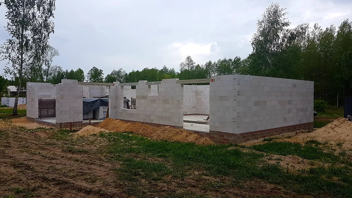 Dom wybudowano w technologii murowanej Solbet. Podstawę budynku stanowią ławy fundamentowe. Więźba dachowa została wykonana z prefabrykowanych wiązarów dachowych, które pokryto deskowaniem, membraną i blachodachówką. Wykonano kominy systemowe wentylacyjne oraz spalinowe i dymowe z wkładami ceramicznymi w kotłowni i salonie. Ponieważ na strychu nie planowano pomieszczeń użytkowych, a jedynie ma służyć jako przechowalnia lekkich rzeczy, zrezygnowano z tradycyjnych stropów żelbetowych, redukując tym samym koszty budowy. Lekki strop wykonany na konstrukcji wiązarów dachowych ocieplono metodą wdmuchiwania celulozy. Zamontowano okna trzyszybowe, drzwi wejściowe z naświetlem bocznym oraz dwie bramy garażowe segmentowe z napędem elektrycznym. Poza zakresem prac doprowadzających budowę do stanu surowego zamkniętego wykonano instalację elektryczną, wodno-kanalizacyjną, tynkowanie ścian wewnętrznych, instalację centralnego ogrzewania (podłogową) wraz z wylewkami cementowymi oraz rekuperację. Ściany zewnętrzne ocieplono styropianem, zamontowano parapety i podbitkę dachową, elewację wykończono tynkiem silikonowym.